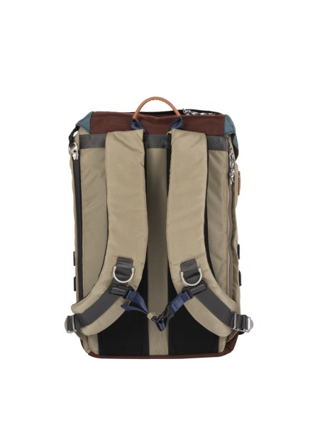 Skórzane paski górnej klapy plecaka zapinane są na solidne metalowe zatrzaski. Paski przechodzą przez bardzo charakterystyczną zewnętrzną linę, do której można doczepiać różne akcesoria. Komora główna została dodatkowo zabezpieczona ściąganym sznurkiem.